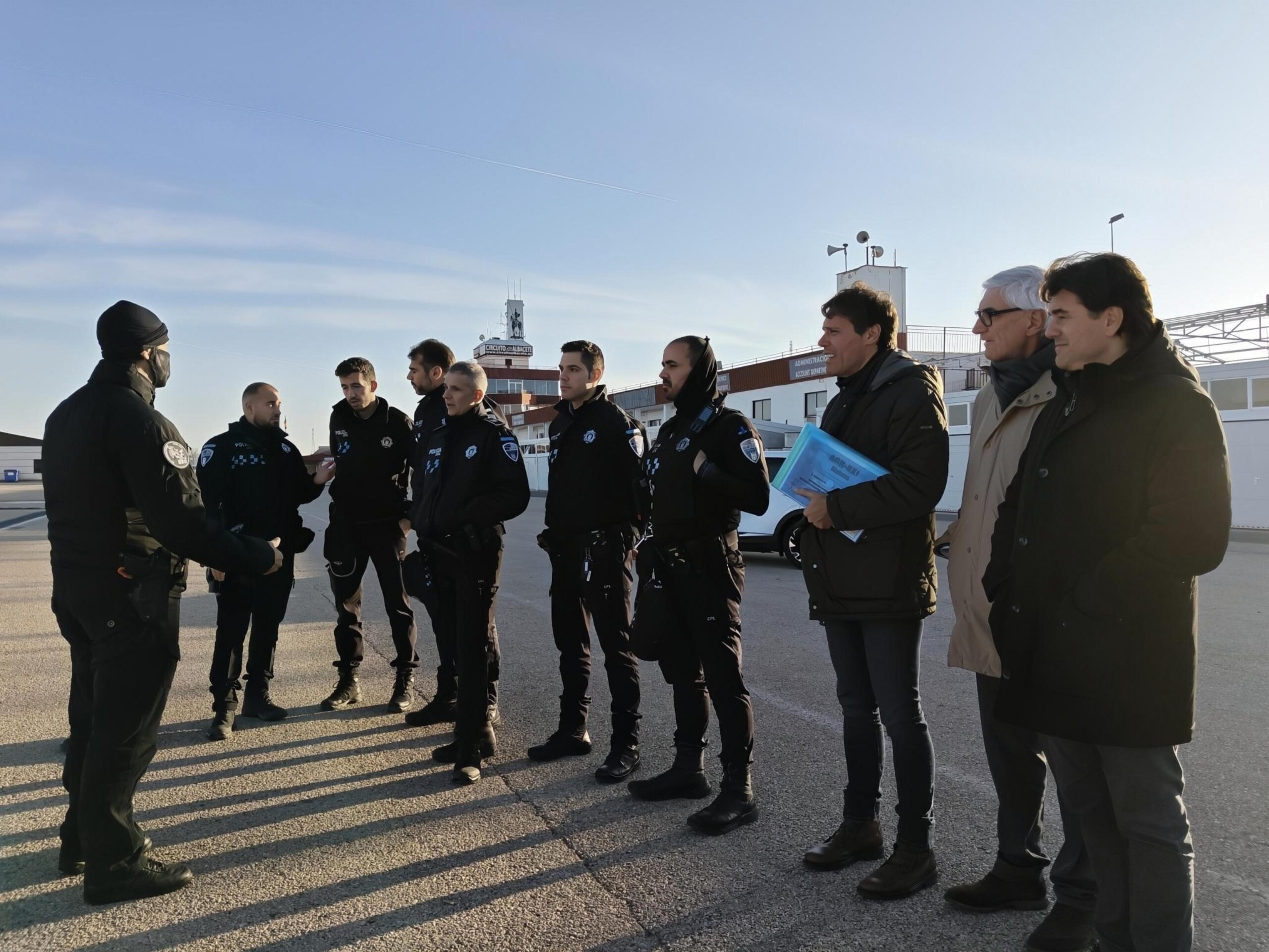 El presidente del Consorcio del Circuito de Velocidad y primer teniente de alcalde, Francisco Navarro, junto al concejal de Seguridad Alberto Reina y el jefe de la Policía Local Diego López, han clausurado un curso de entrenamiento táctico operativo que ha sido impartido a 27 efectivos policiales (agentes y mandos), y que en la parte de abordaje de vehículos y especialización en frenada se ha desarrollado en las pistas del Circuito.